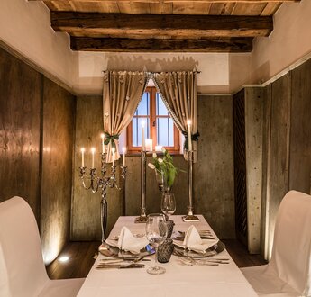 In der Josephi-Stube erwartet Sie ein Fest für die Sinne. Bringen Sie Appetit mit und genießen Sie ein romantisches Gourmet-Dinner für zwei. Kerzenschein, ausgewählte Weine, alte Mauern und Holzvertäfelungen aus vergangenen Jahrhunderten schaffen ein Ambiente, das verbindet. Ein Erlebnis für besondere Anlässe und Momente, die bleiben. Hier wird Genuss zur Erinnerung - leise, intensiv und voller Tiefe.
