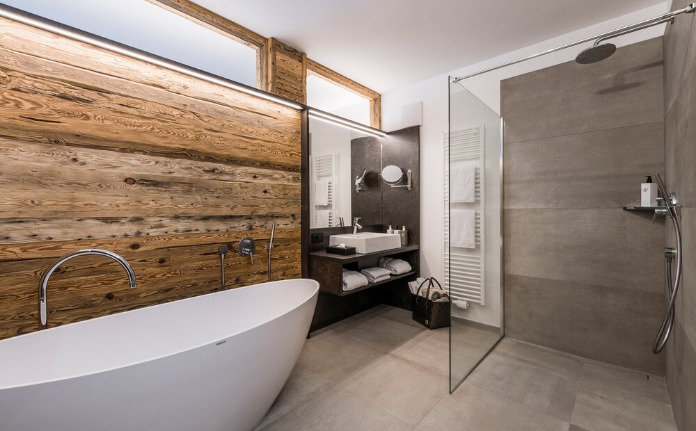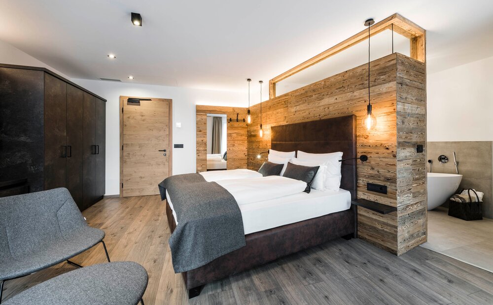 Hier trifft alpine Klarheit auf wohltuende Ruhe. 300 Jahre altes Holz, modernes Ambiente und viel Licht schaffen Raum zum Durchatmen. Die freistehende Badewanne lädt zum Loslassen ein - Ihr privater Rückzugsort für entspannte Nächte und bewusste Momente mit Blick zum Vinschger Sonnenberg und in die Apfelgärten.