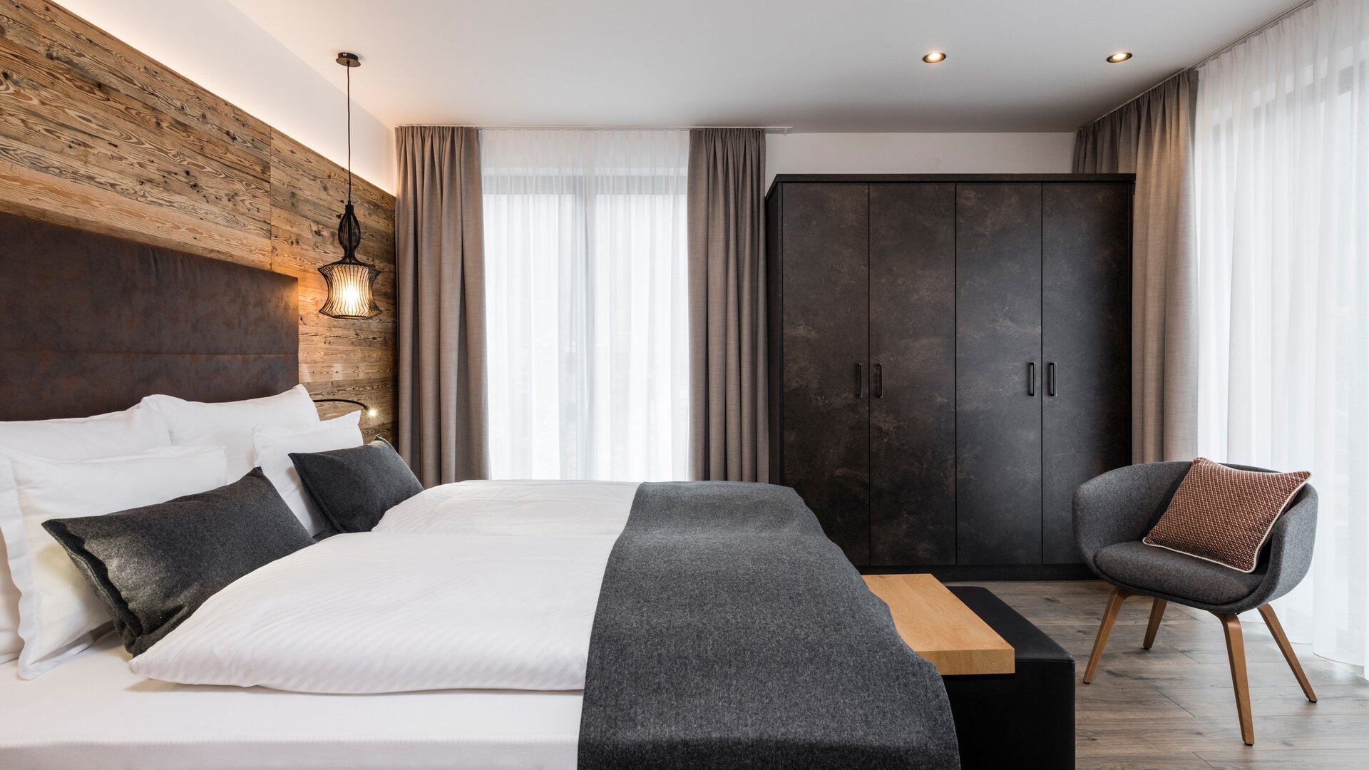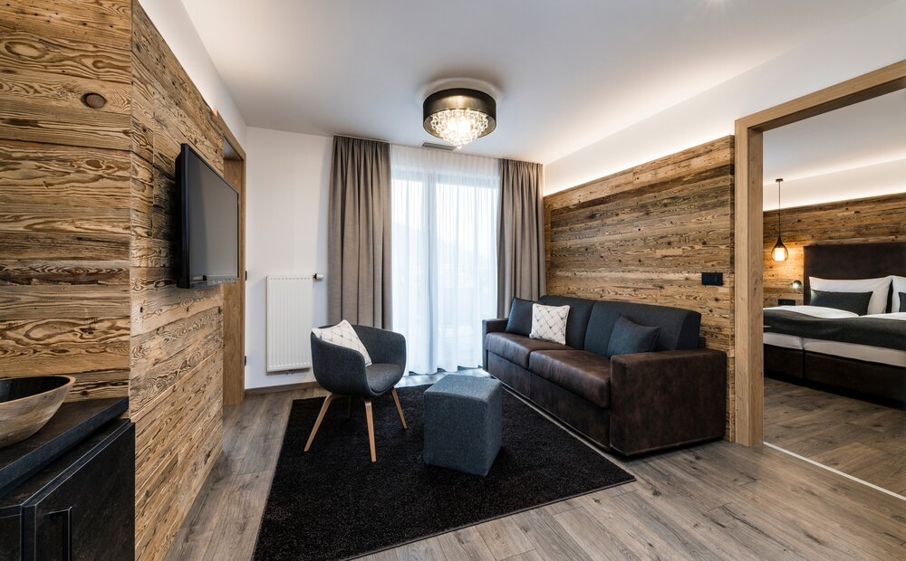 Die Familien-Penthouse-Suite öffnet den Blick in die Weite des Vinschgaus. Großzügige Räume, 300 Jahre altes Holz und ein traumhafter Panoramablick schaffen Raum für gemeinsame Zeit. Ein separates Schlafzimmer sorgt für Rückzug und Privatsphäre - stilvoll wohnen, voller Gemütlichkeit und Aussicht.