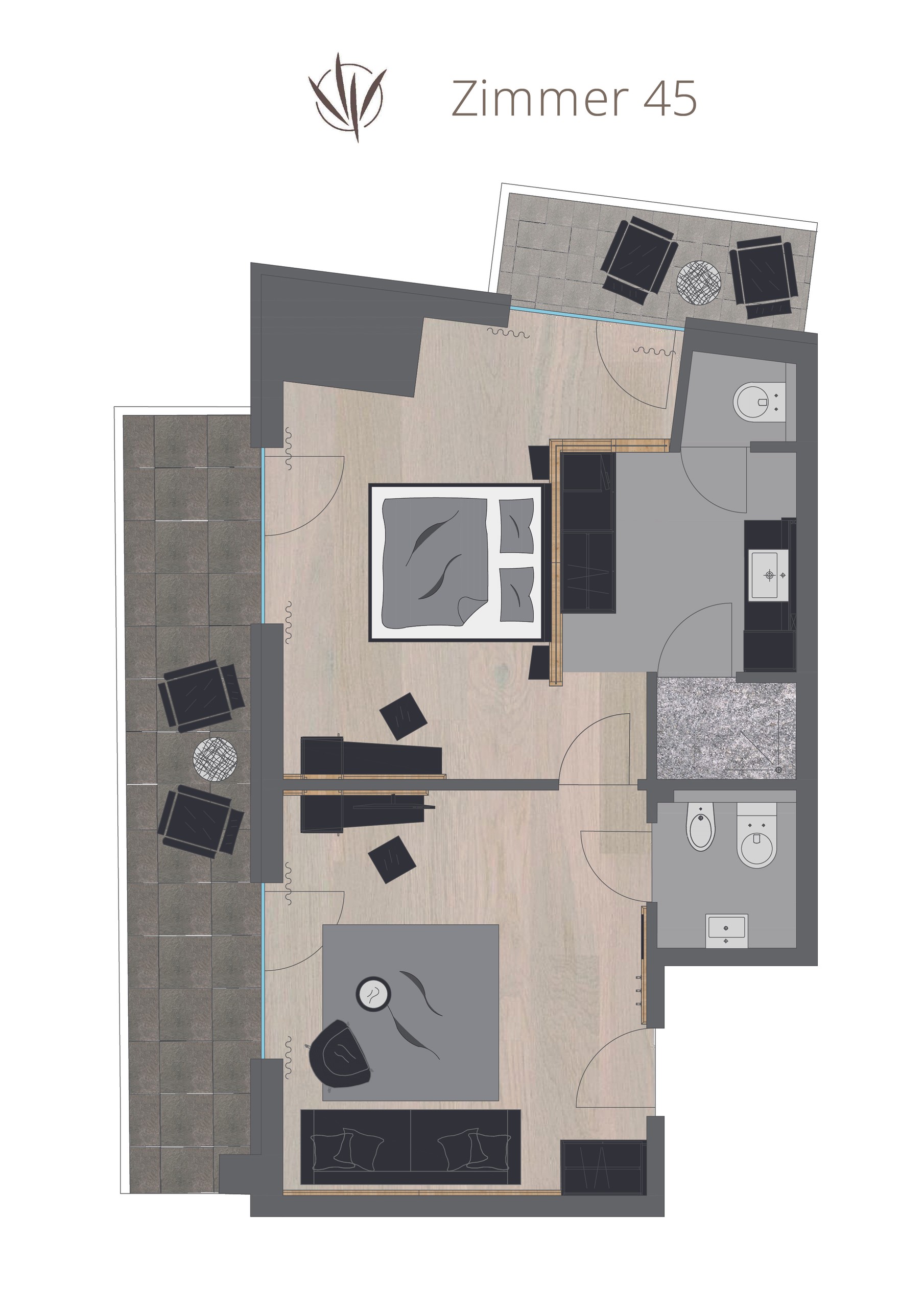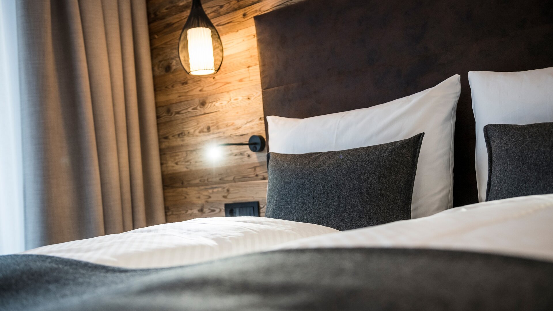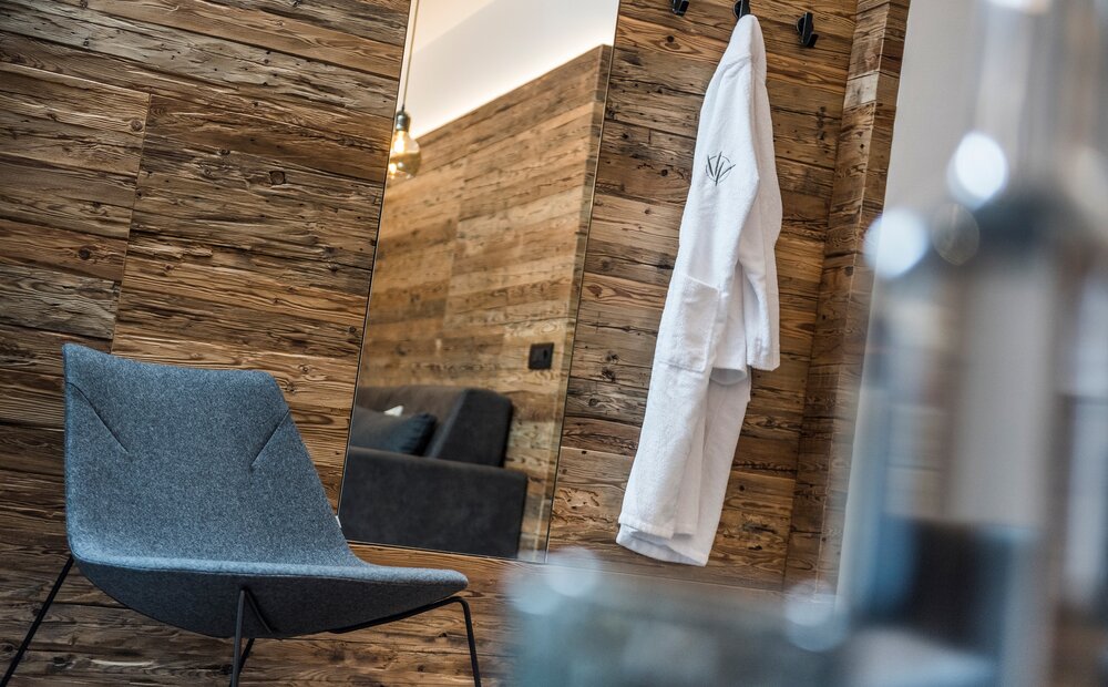 300 Jahre altes Holz und weiche Filzkissen bringen Wärme und Gemütlichkeit in diese moderne Suite. Großzügige Fenster öffnen den Raum zur Bergwelt und schaffen ein Wohngefühl voller Freiheit. Ein stilvoller Rückzugsort im Vinschgau, der Tradition und Moderne mit beeindruckender Aussicht vereint.