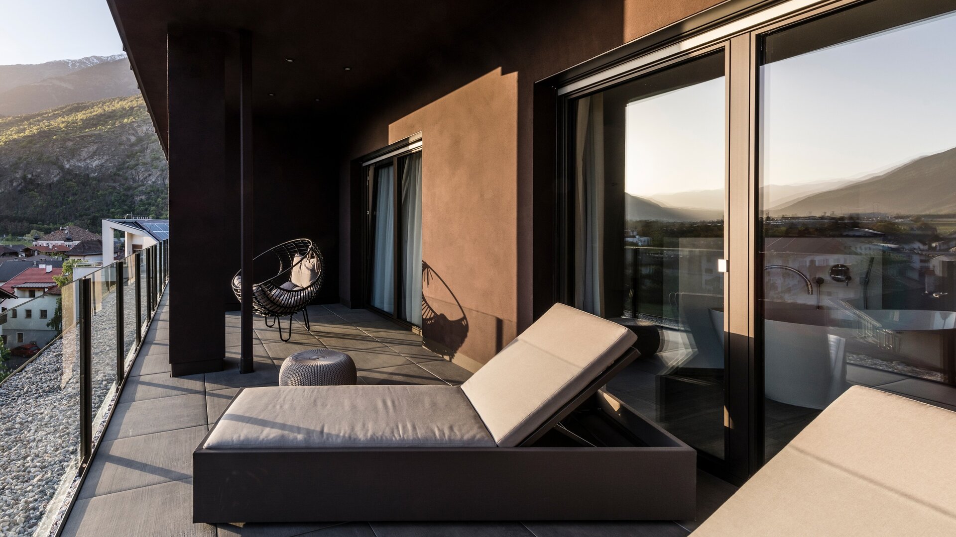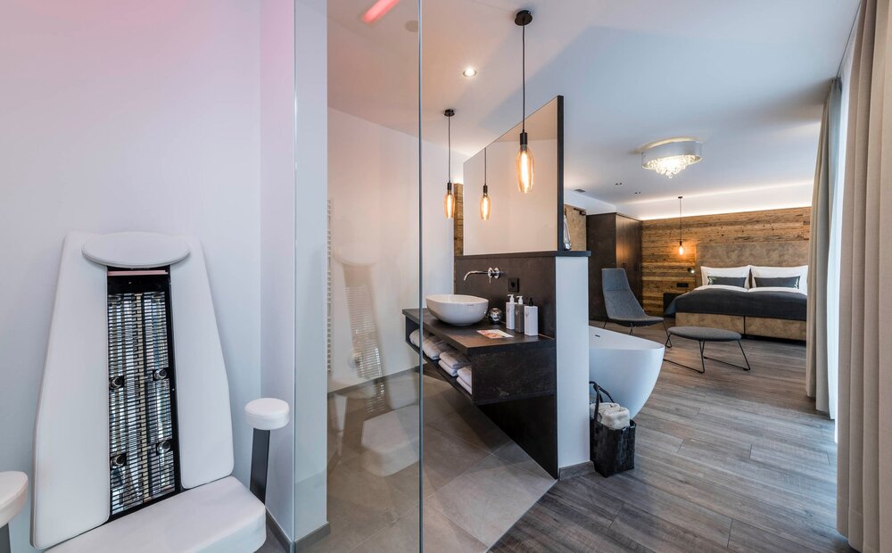 Die Spa-Suite verbindet Großzügigkeit mit privater Auszeit. Die freistehende Badewanne wird zum Ort ruhiger Momente, die Infrarotkabine schenkt wohltuende Tiefenentspannung. Natürliche Materialien, weiches Abendlicht und die große Loggia mit Panoramablick schaffen ein Refugium für bewusste Auszeiten im Herzen des Vinschgaus.